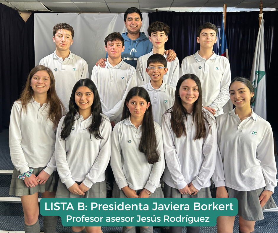 Presidenta Javiera Borkert (2° medio B); Vicepresidente Mateo López (2° medio B); Secretaria Emilia Sáez (2° medio B); Tesorero José Tomás Luksic (2° medio A); Delegada María Jesús Quiñones (1° medio B); Ministros Bastian Riedel (2° medio A), Maximiliano Carvacho (1° medio A), Amparo Moscoso (8° A), Fernanda Canales (7° A) y Sebastián Fontena (6° A).
