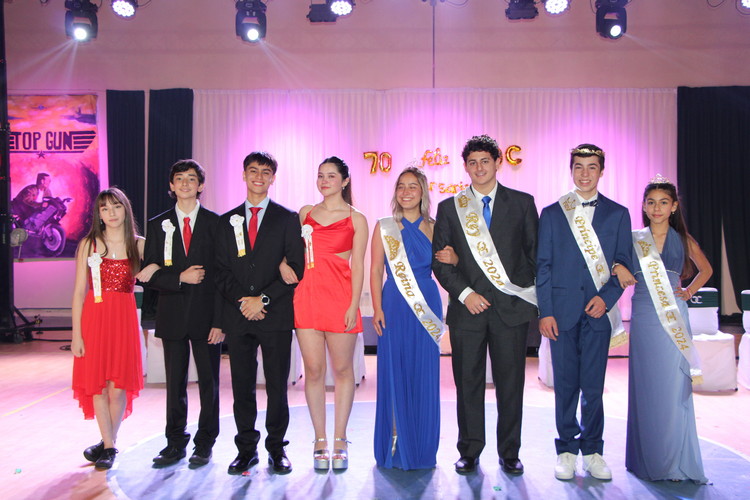 Felices estaban también sus compañeros y príncipes, Gabriel Muñoz y María Javiera Negroni; el capitán Vicente Guerrero y la co-capitana Bernardita Fuentes, y todos los estudiantes y apoderados de los cursos 7° A, 8° B, 2° medio A, 2° medio B, 3° medio B y 4° medio B que dieron lo mejor de sí, participando activamente del programa de actividades organizado por el Centro de Alumnos con apoyo del cuerpo docente para celebrar los 70 años de nuestro colegio.
